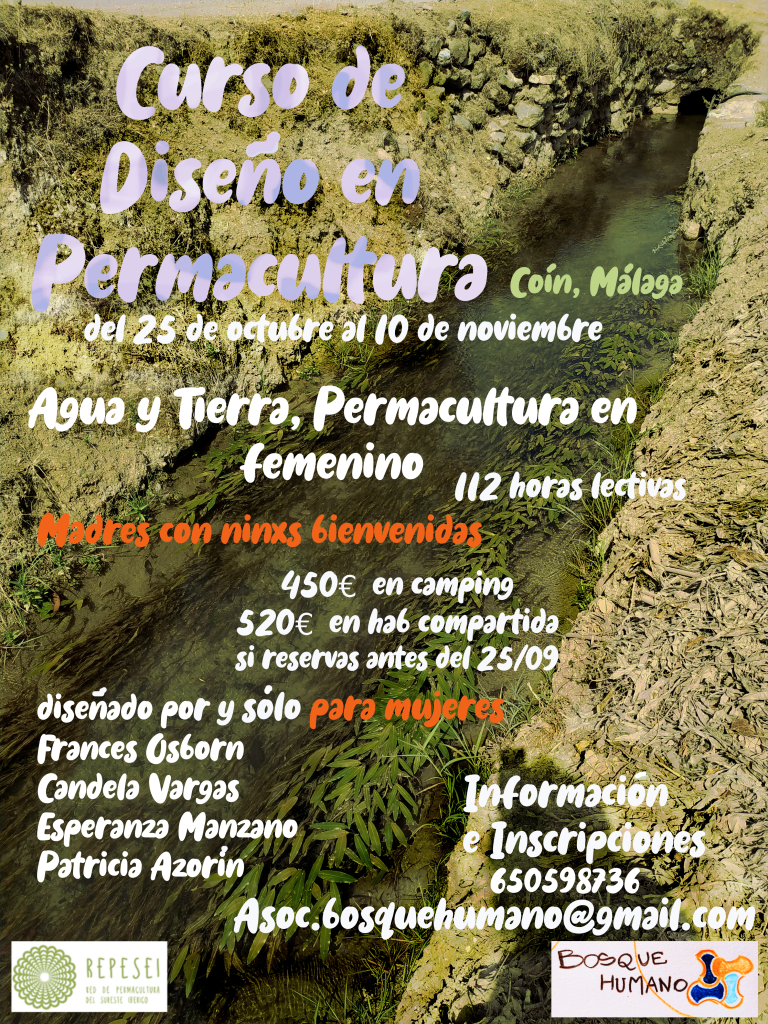 Viviremos la permacultura en el proyecto BOSQUE HUMANO, Coín, en Málaga. Antiguas tierras agrarias regadas por acequias, serán el escenario para este curso que potenciará en nosotras crear comunidades saludables y tejer redes sólidas.