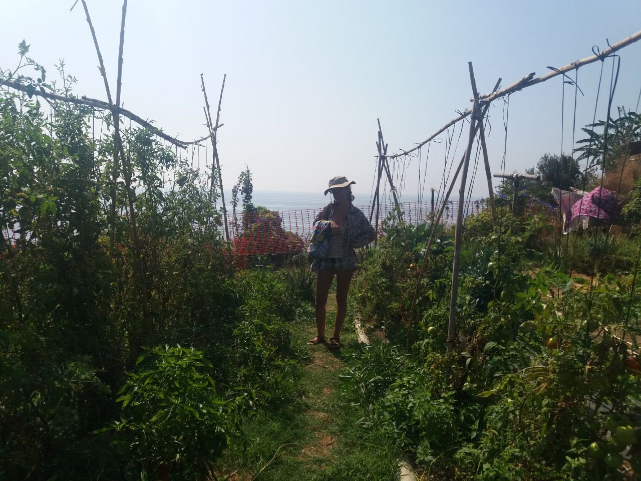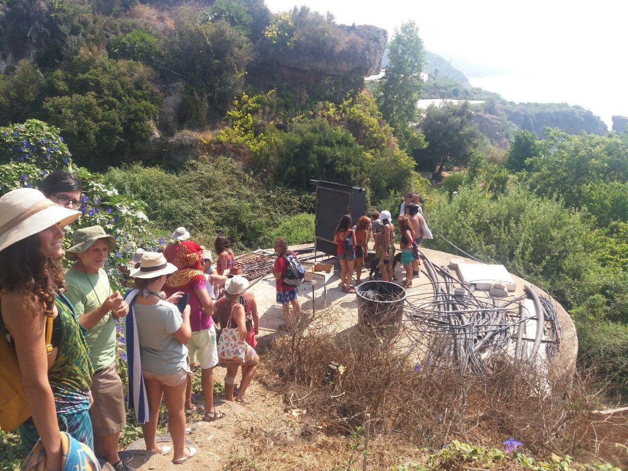 El sábado por la mañana fuimos de visita a una finca cercana, la de Sabina y Aurelio, y nos sorprendimos con la biodiversidad que generan y cuidan a orillas del mar… un wáter seco por aquí, otro por allá, duchas, habitaciones de bioconstrucción reciclada… una maravilla! Hasta bajar a la playa. El baño comunal de todas las que éramos fue de lo más bonito.