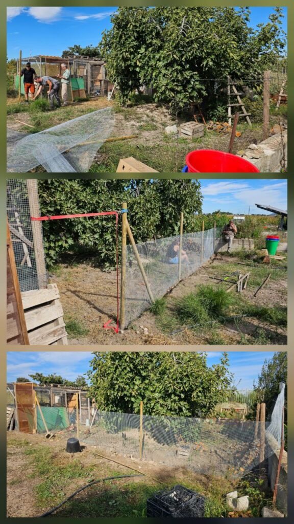 Al mismo tiempo se realizó la siembra de multitud de árboles creando nuevos espacios y vergeles, la ampliación del gallinero, una nueva caseta para el tractor con balas de paja y un muy bien explicado y puesta en práctica taller de poda con Alfonso. También realizamos la escalera hacia el embalse entre otros tragozos que aparecían.