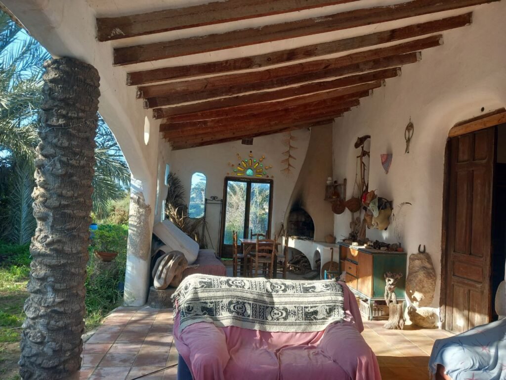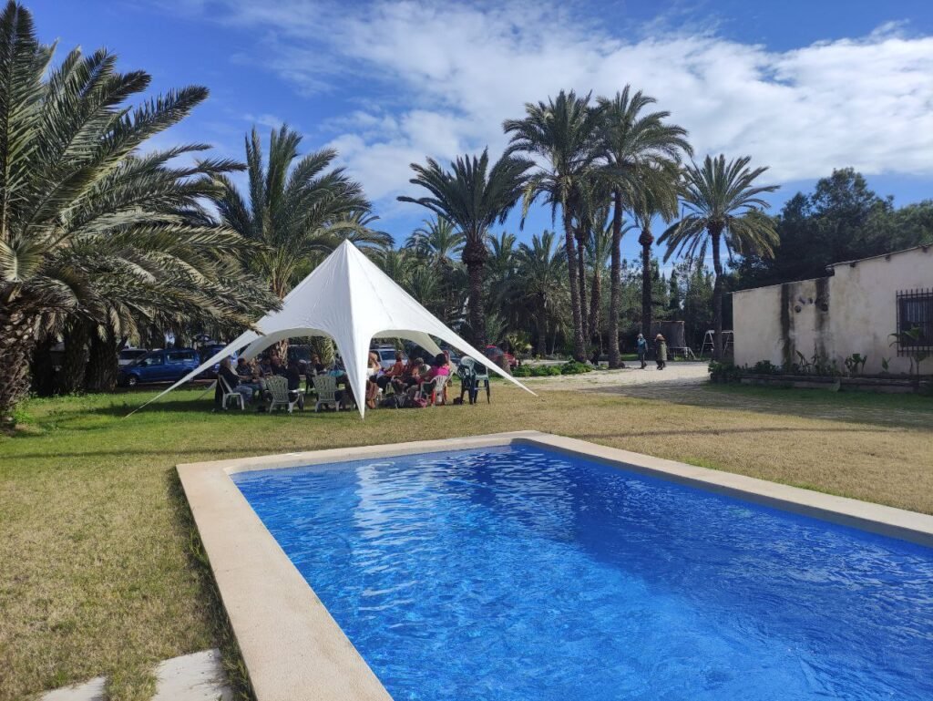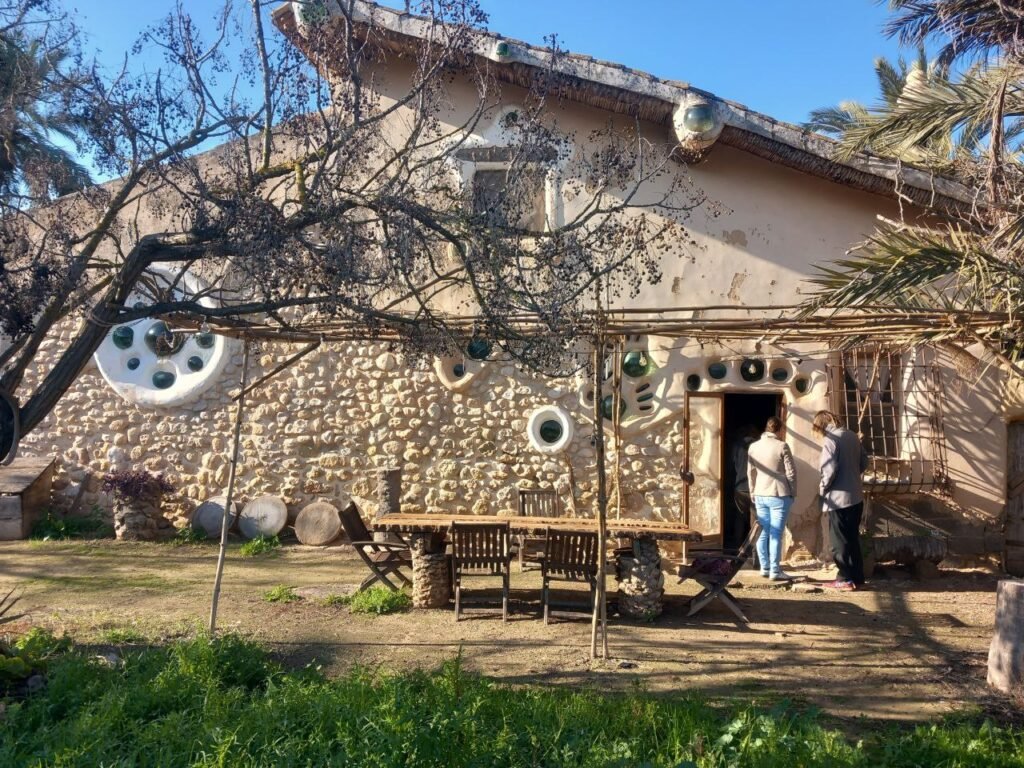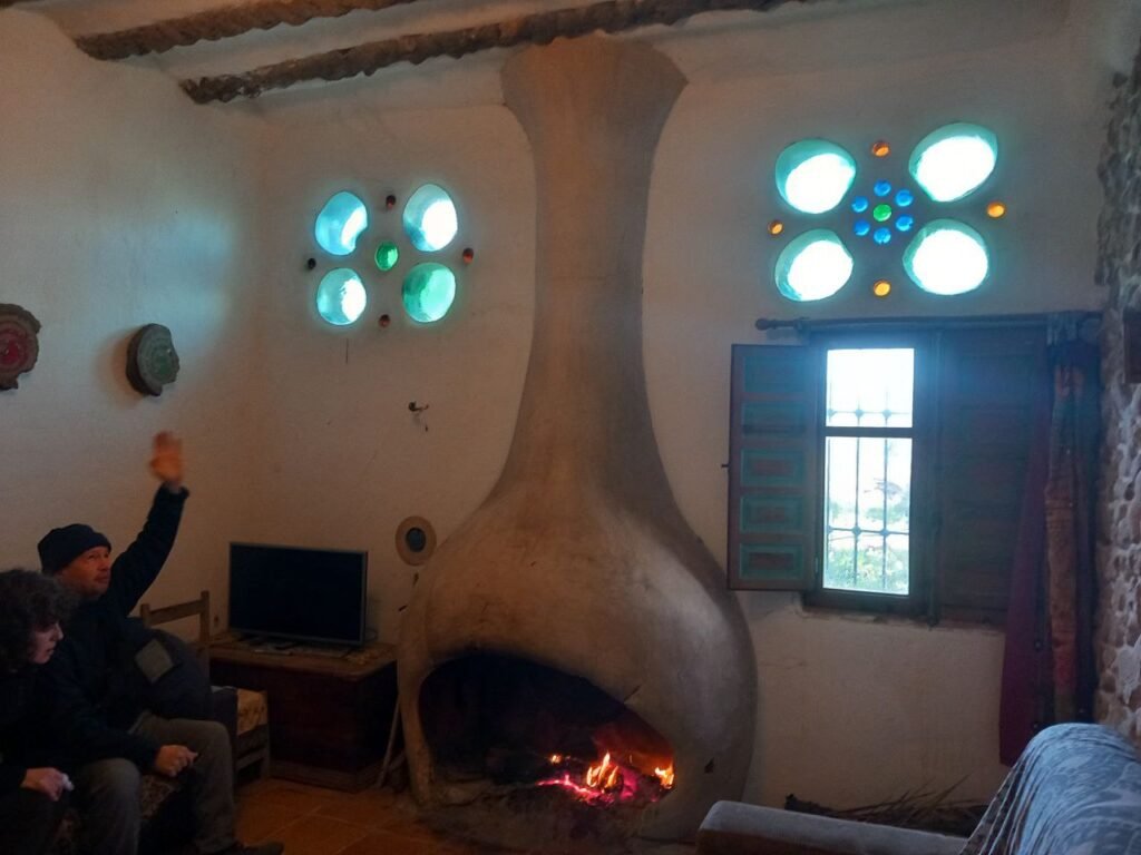 A las 10 salimos para la casa de Vicente Campos. Vicente es palmerero de profesión, pero también es ebanista, bioconstructor y por encima de todo un entrañable amigo. Nos recibió en el jardín de su casa y nos animó a participar en círculo con una dinámica energizante. A continuación pasamos al interior de la casa. Al calor de la chimenea, nos explicó detalles muy interesantes sobre las palmeras, sobre los ladrillos de tierra prensada con los que hizo las paredes de su casa. Después volvió a hacer una dinámica de grupo para entender el crecimiento de las palmeras. Entre juegos y risas salimos de nuevo al jardín, donde acabó la visita explicándonos algunos detalles de su piscina natural. A pesar de que se tuvo que marchar, como detalle de cortesía, nos preparó una infusión y nos permitió quedar en su casa. Pudimos observar, disfrutar y fotografiar detalles constructivos muy interesantes.
