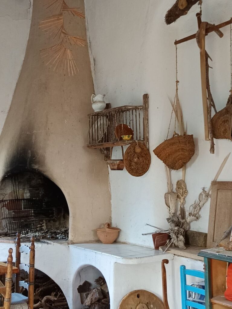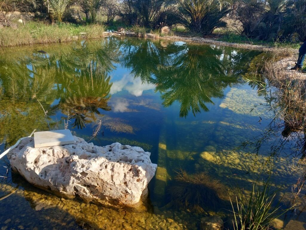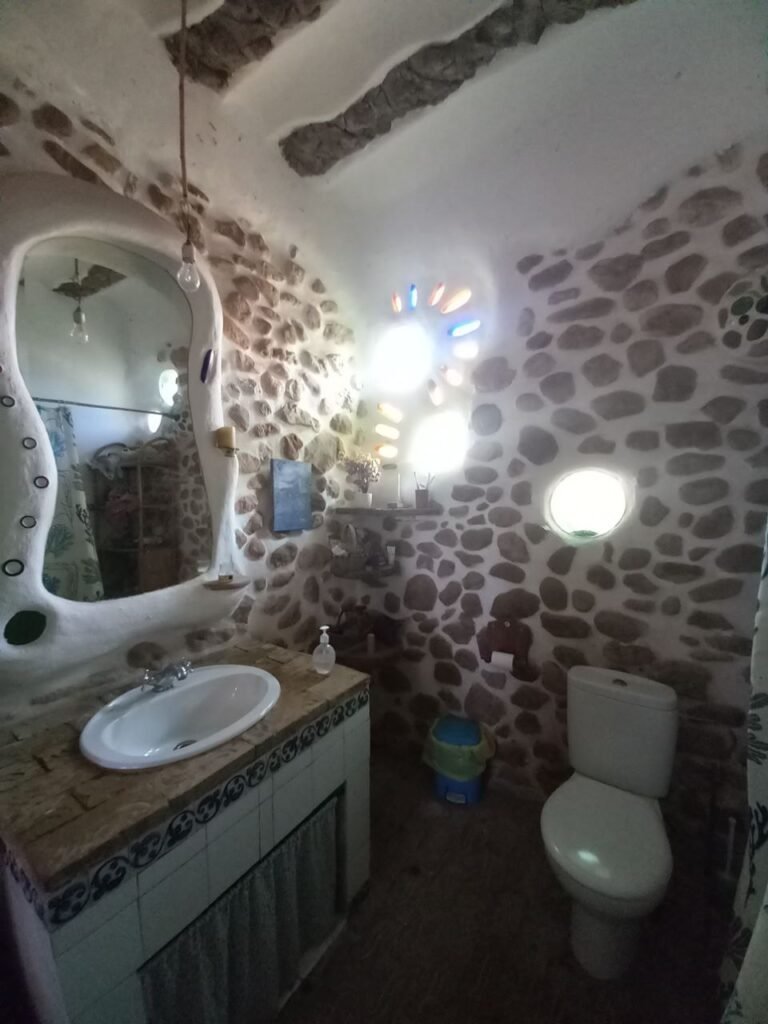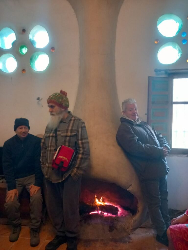 A las 10 salimos para la casa de Vicente Campos. Vicente es palmerero de profesión, pero también es ebanista, bioconstructor y por encima de todo un entrañable amigo. Nos recibió en el jardín de su casa y nos animó a participar en círculo con una dinámica energizante. A continuación pasamos al interior de la casa. Al calor de la chimenea, nos explicó detalles muy interesantes sobre las palmeras, sobre los ladrillos de tierra prensada con los que hizo las paredes de su casa. Después volvió a hacer una dinámica de grupo para entender el crecimiento de las palmeras. Entre juegos y risas salimos de nuevo al jardín, donde acabó la visita explicándonos algunos detalles de su piscina natural. A pesar de que se tuvo que marchar, como detalle de cortesía, nos preparó una infusión y nos permitió quedar en su casa. Pudimos observar, disfrutar y fotografiar detalles constructivos muy interesantes.