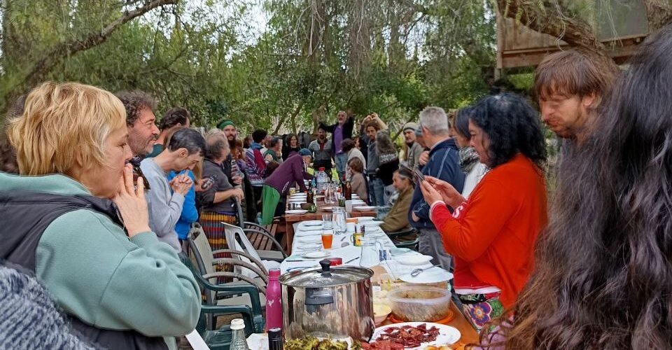 Sobre las 15h. Para la hora de comer eramos ya cerca de 50 personas que degustamos los varios manjares preparados con el amor y los ingredientes de calidad habituales, entre los que destacaría las migas a la leña que nos cocinó Jose Sifones. (gracias Jose). Andrés, el sábado por la tarde estuve instalando la iluminación y el sonido para la fiesta, le he pedido a Raquel que escriba algo sobre el taller de sueños, las otras actividades y la cena si quieres comenta tú algo.